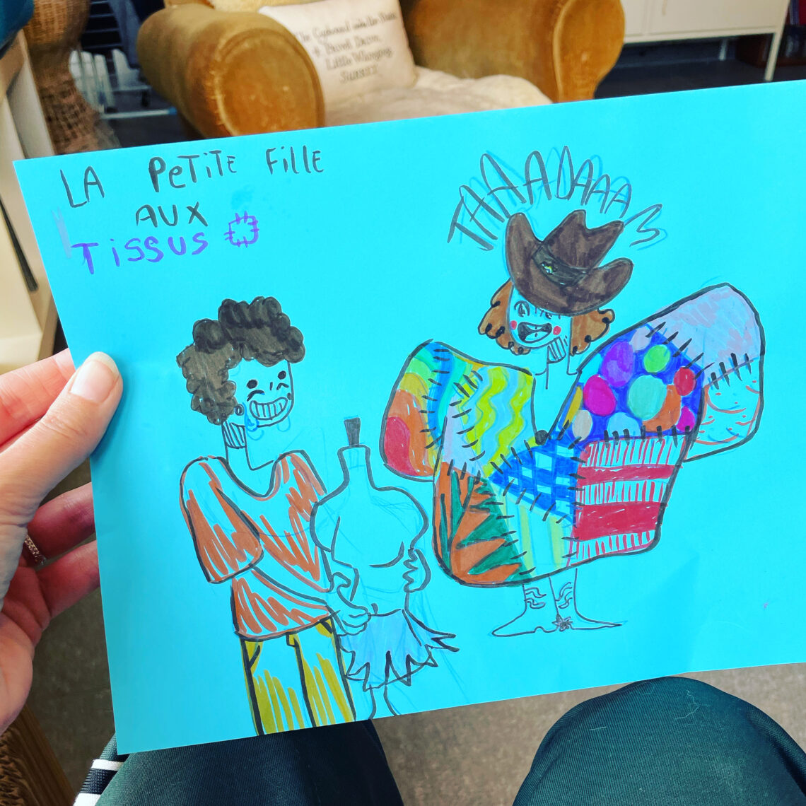 Tout le monde a un talent. Le talent de la petite fille aux tissus, c’est son amour pour le monde textile. Jeanne aime tellement les tissus qu’elle a envie de passer le plus de temps possible à les observer. Son autre passion, c’est imaginer des costumes de théâtre et les coudre avec son ami Angelo. Pour Jeanne, la couture, c’est naturel, à tel point qu’elle ne se rend pas vraiment compte que c’est son talent. Ça la gêne un peu quand on dit qu’elle est douée. Elle préfère se dire qu’elle aime les tissus. Un de ses nombreux autres talents est probablement la simplicité. Et toi, ton talent à toi,…
